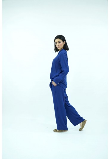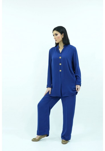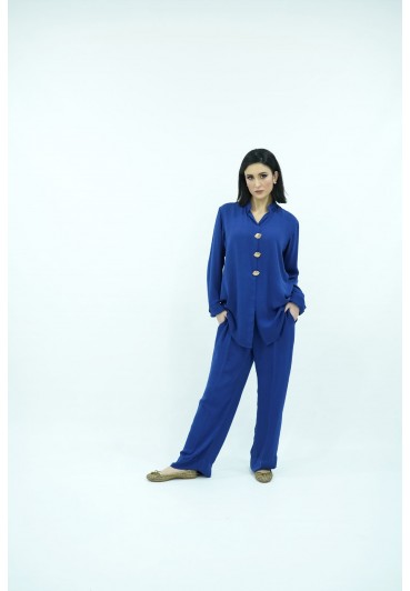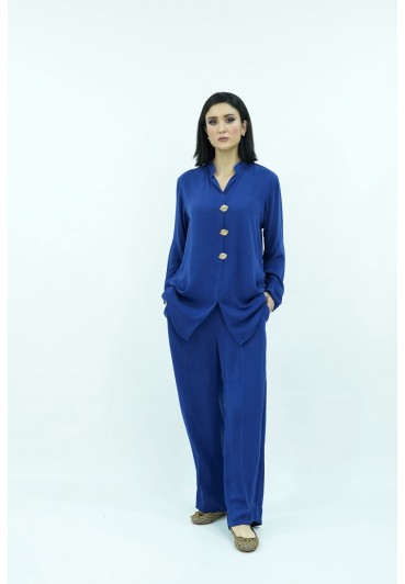 Blue crepe 2pc coord set with front button shirt and paired with wide leg pants.