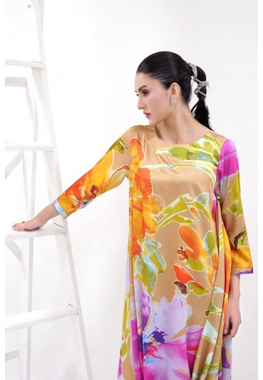 Beige and multi coloured floral silk printed 2pc suit.