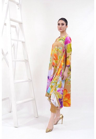 Beige silk with multi coloured floral print 2pc suit with long flowy length shirt with side loop design. Shirt is paired with beige emboss print straight pants.