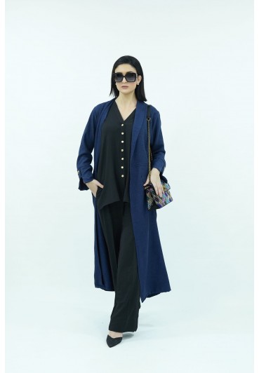 Black and blue crepe 3pc suit. Blue and black crepe 3pc suit with black solid inner slip with buttons and black wide leg pants paired with long blue solid crepe coat.
